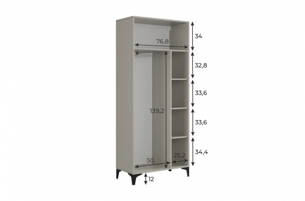 Шкаф оснащён надёжными металлическими ручками и имеет удобное внутреннее наполнение: справа расположены полки, а слева — штанга для вешалок. Это позволяет рационально использовать пространство и разместить различные типы одежды.