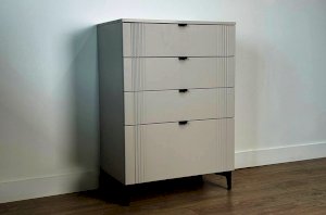Комод изготовлен из качественных материалов: корпус выполнен из ЛДСП, что гарантирует прочность и долговечность, а фасад, выполненный из МДФ в плёнке ПВХ, не только выглядит эстетично, но и защищает комод от повреждений. Особое внимание заслуживает фрезеровка фасадов, которая придаёт изделию изысканный вид.
