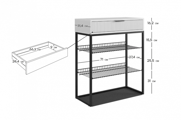 Обувница Вельвет прекрасно сочетает в себе стиль и функциональность. Её дизайн в стиле лофт идеально подходит для современных интерьеров. Выдвижной ящик с шариковыми направляющими обеспечивает бесшумное и плавное открывание, предоставляя удобный доступ к вашим аксессуарам и мелочам. Регулируемые опоры и специальный коврик обеспечивают дополнительный комфорт и защиту.